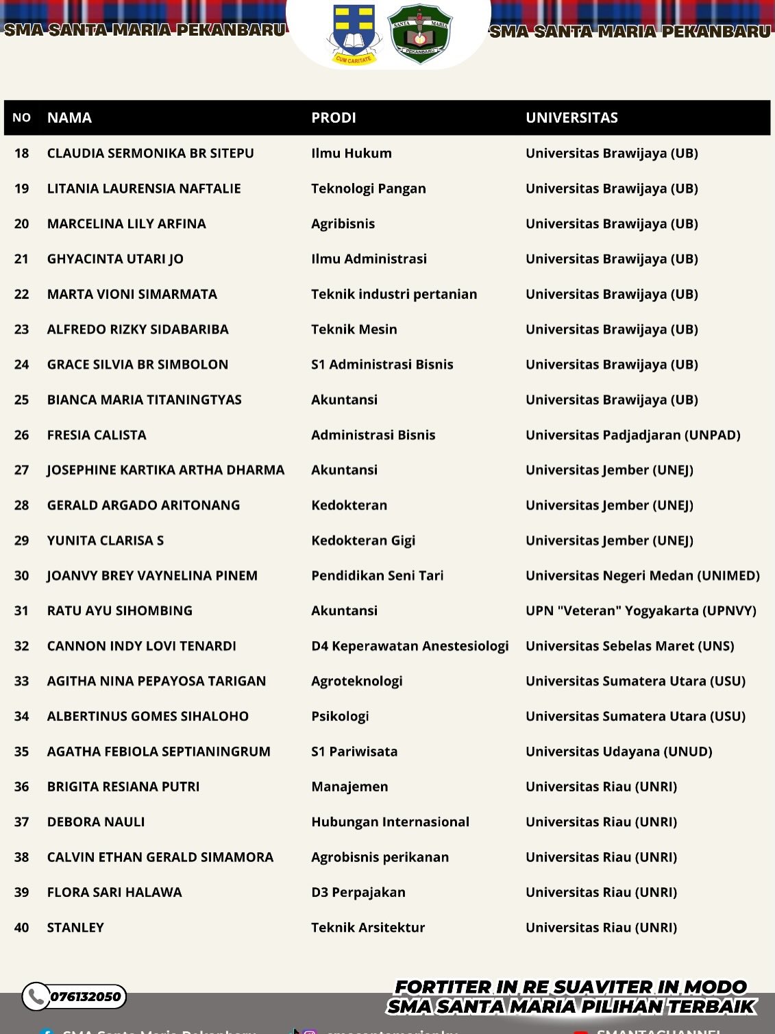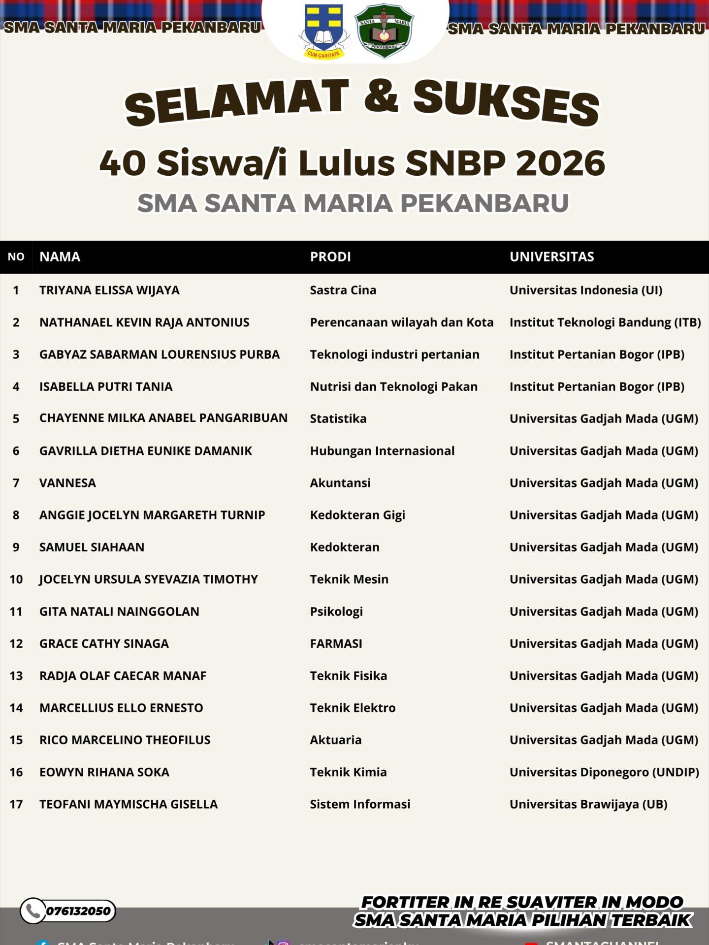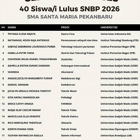Selamat dan bangga kepada 40 peserta didik hebat yang berhasil lolos masuk ke PTN terbaik di Indonesia pada SNBP 2026.