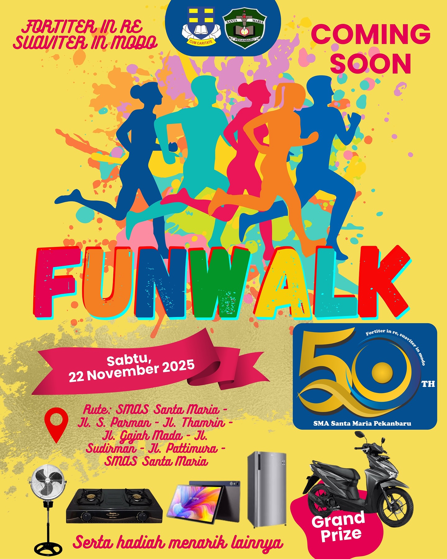 Funwalk 50 Tahun SMA Santa Maria Pekanbaru siap digelar sebagai bagian dari kemeriahan Pesta Emas ke- 50 tahun. . Kegiatan ini mengajak seluruh peserta didik, pendik dan tendik unit Santa Maria Pekanbaru,Pengurus Yayasan Prayoga Riau, orangtua peserta didik dan alumnus untuk turut berpartisipasi pada funwalk.