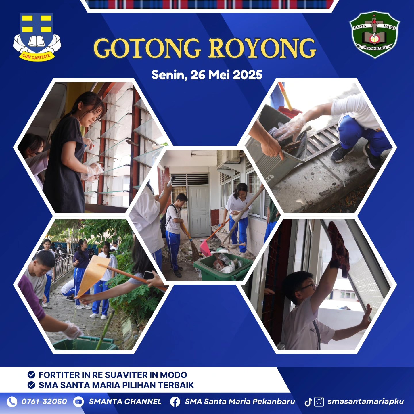 Peserta didik kelas XI SMA Santa Maria Pekanbaru melaksanakan kegiatan gotong royong, yaitu membersihkan lingkungan sekolah pada hari Senin, 26 Mei 2025.
