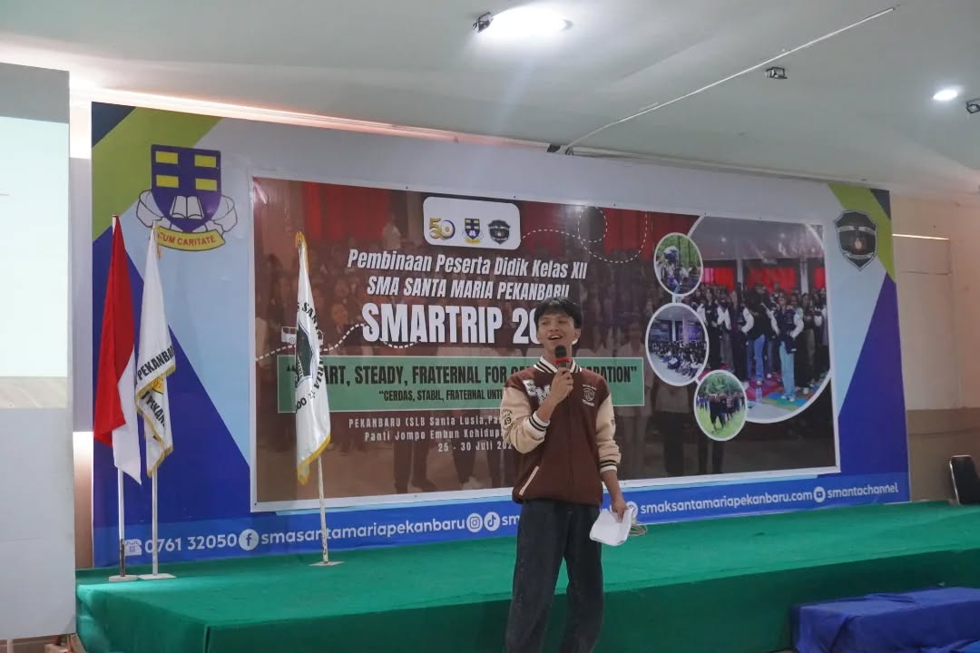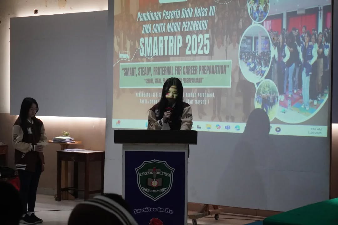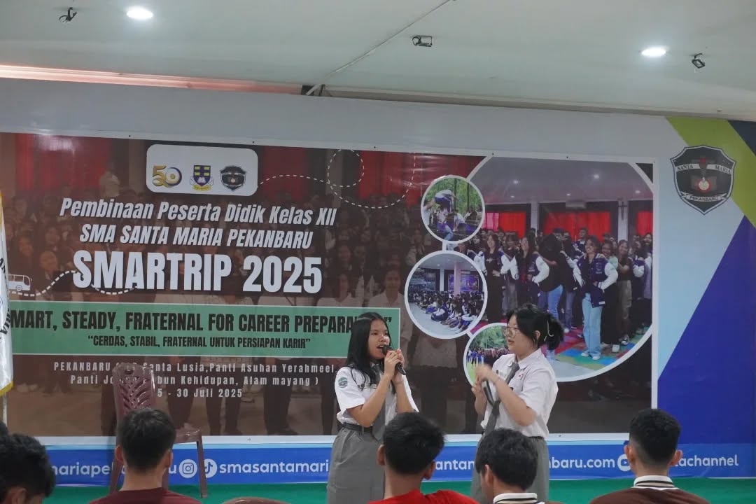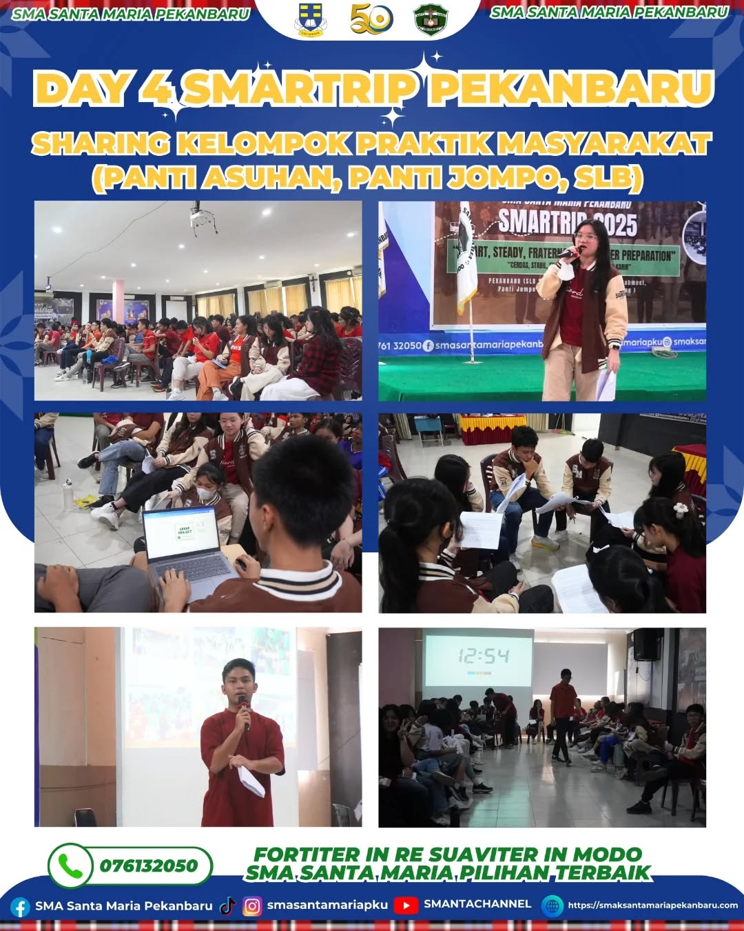 Selasa, 29 Juli 2025, kegiatan Pembinaan Peserta Didik Kelas XII SMARTRIP hari keempat adalah presentasi pengalaman praktik bermasyarakat dan peneguhan reflektif di Ruang Pertemuan SMA Santa Maria. Tujuannya adalah membagikan pengalaman dan memetik nilai baik dari setiap praktik bermasyarakat yang dilakukan di SLB Santa Lusia, Panti Jompo Embun Kehidupan Bangsa, dan Panti Asuhan Yerahmeel sebelumnya.