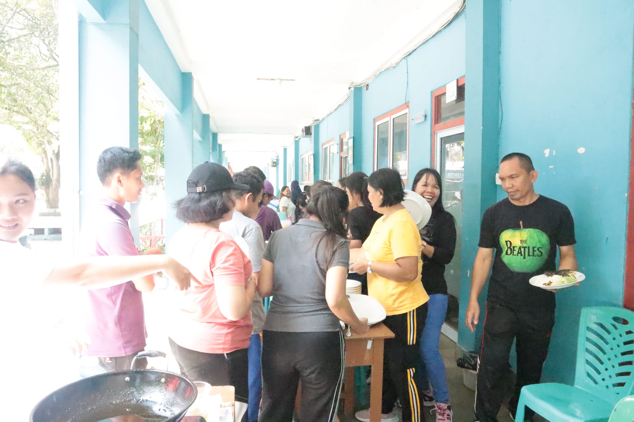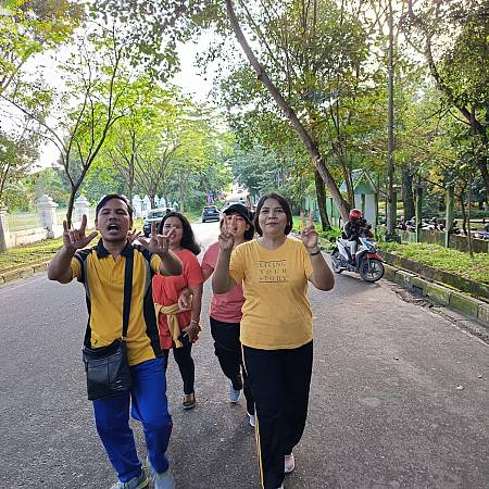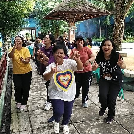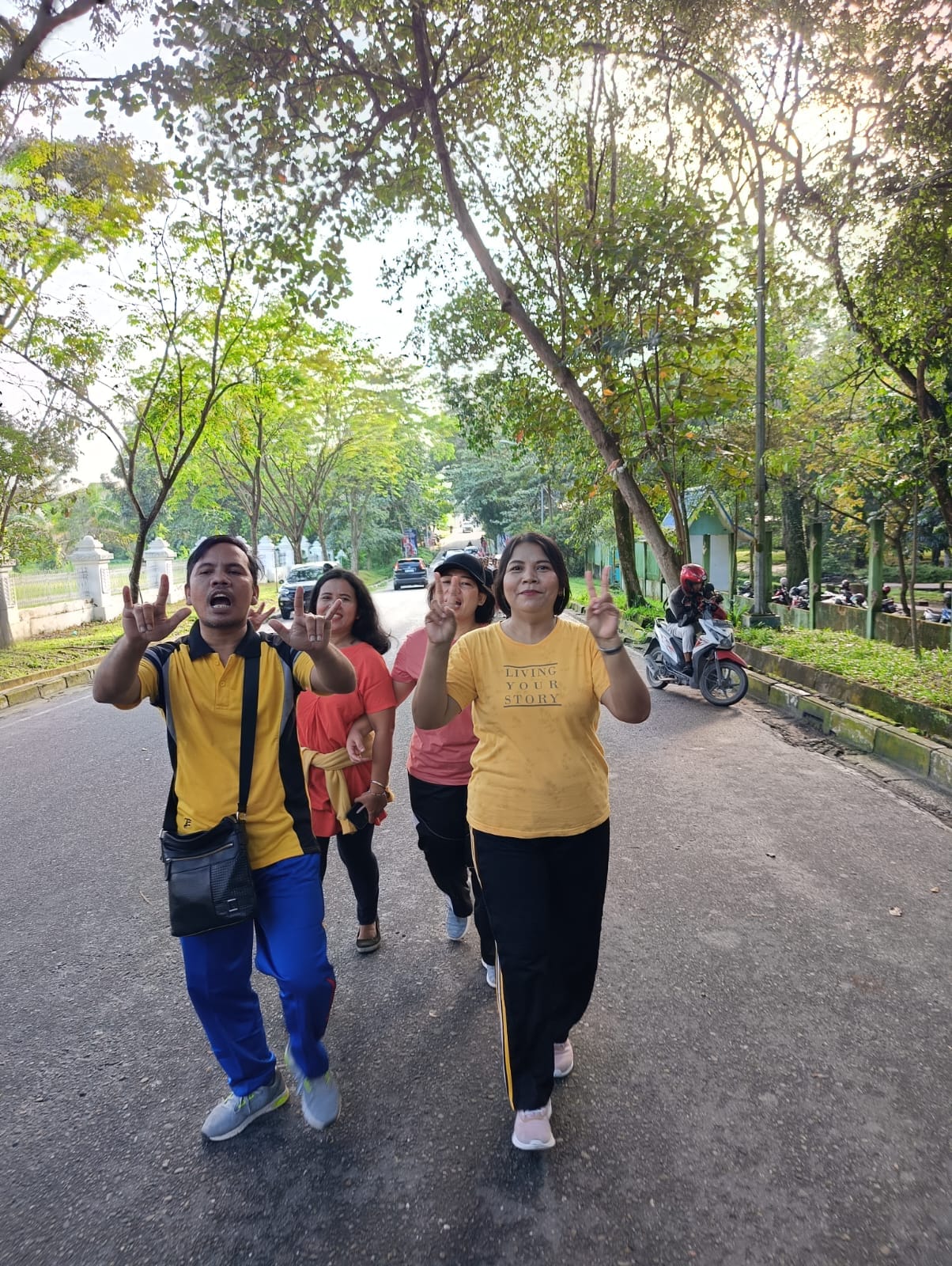 Kami mulai dengan olahraga/jalan santai, games kebersamaan, bernyanyi, makan bersama, dan lucky draw.