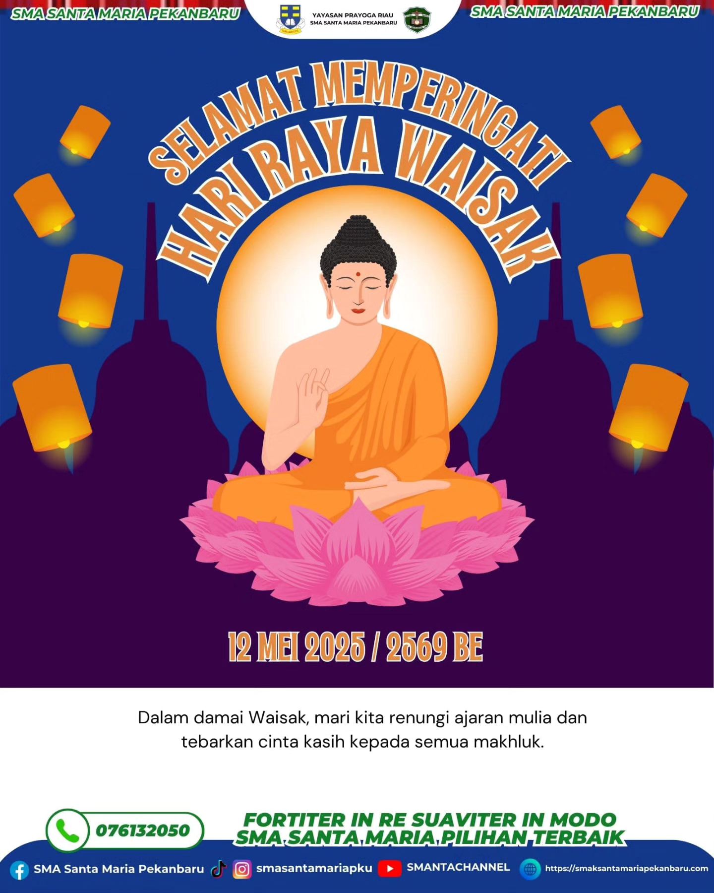 Keluarga besar SMA Santa Maria Pekanbaru mengucapkan selamat hari raya Waisak. Waisak, hari suci untuk merenungkan ajaran Buddha dan mencari kedamaian batin. Semoga cahaya Waisak membawa kita menuju jalan yang benar dan memberikan kedamaian bagi semua makhluk.