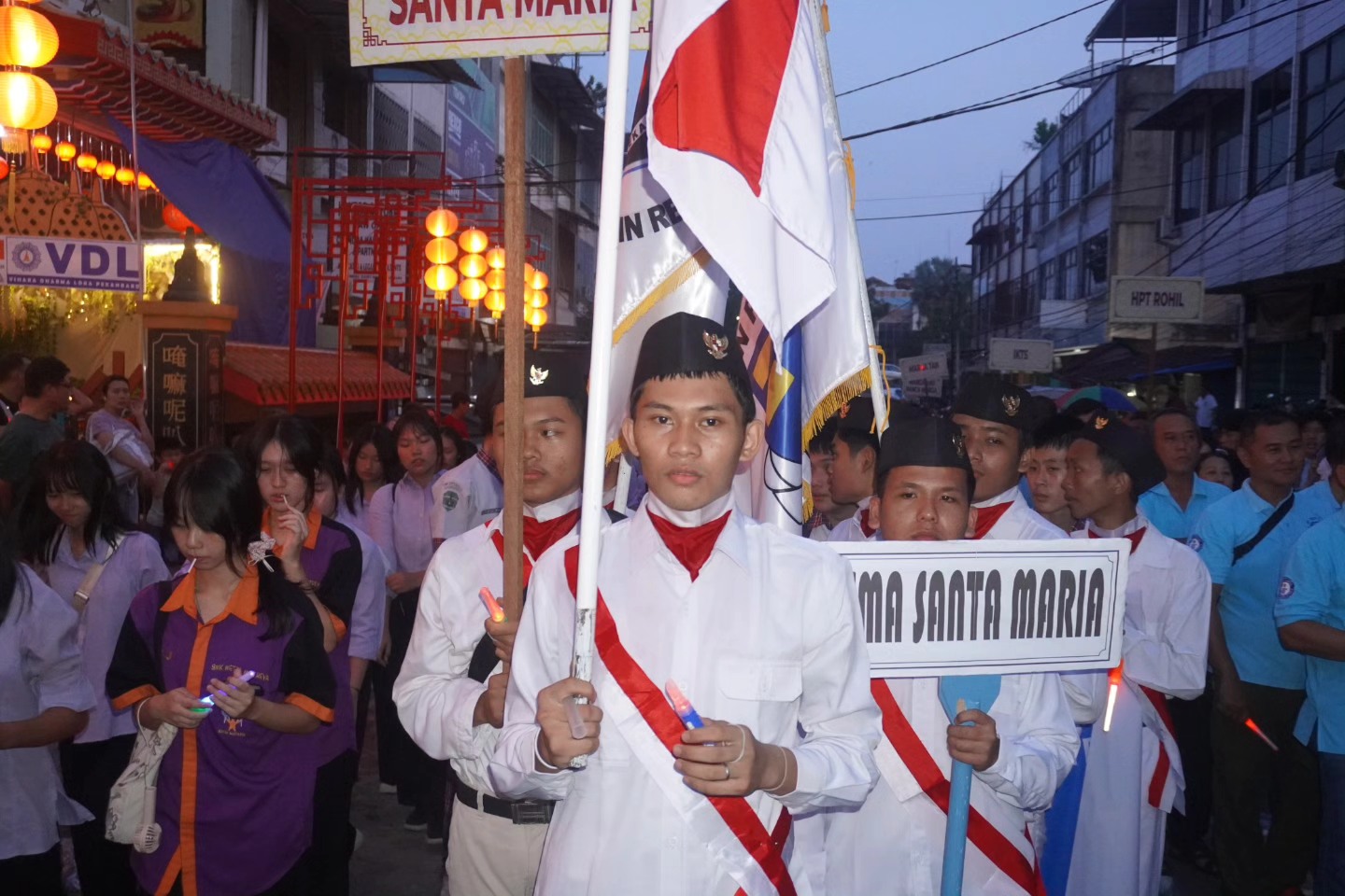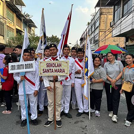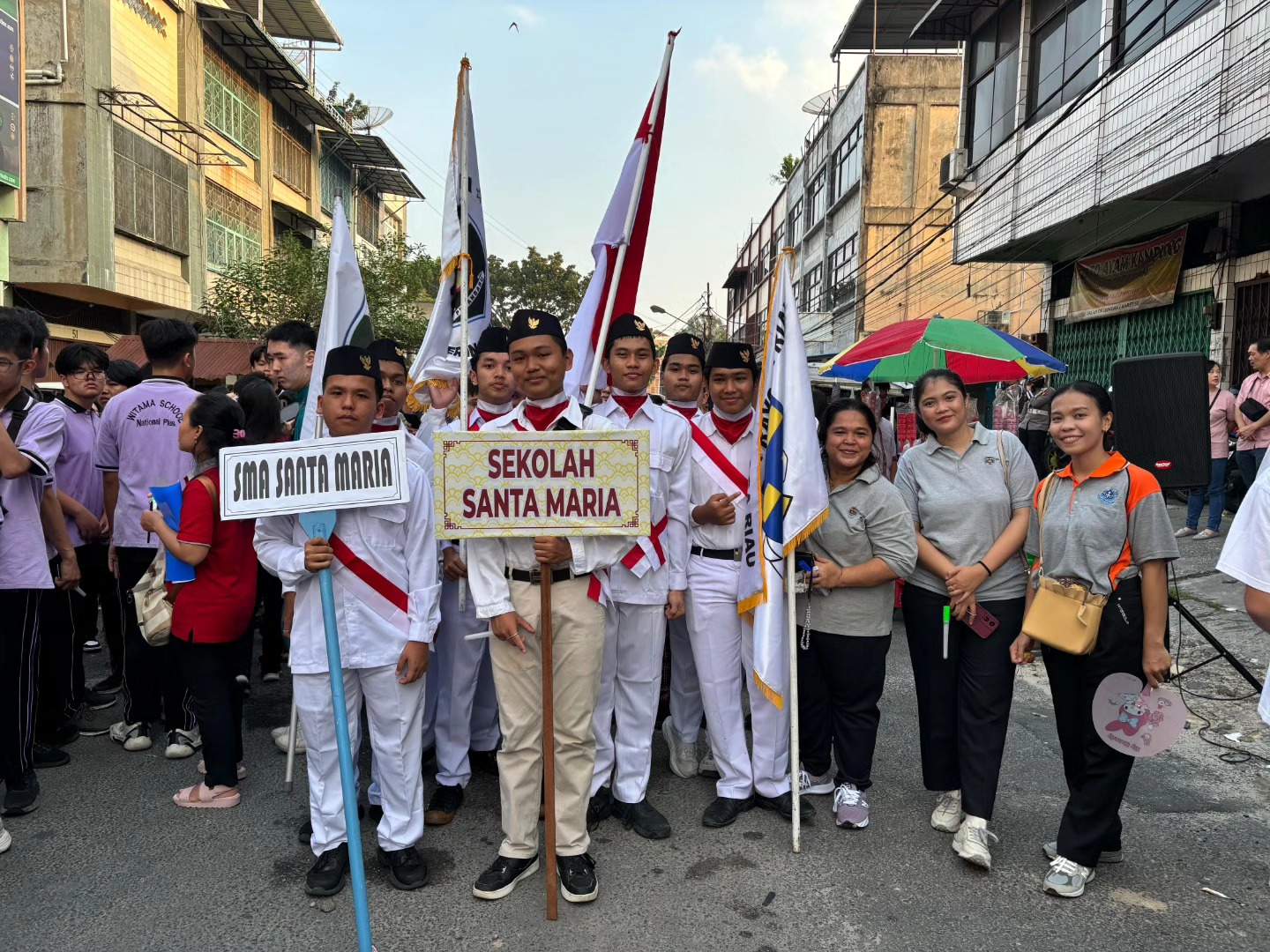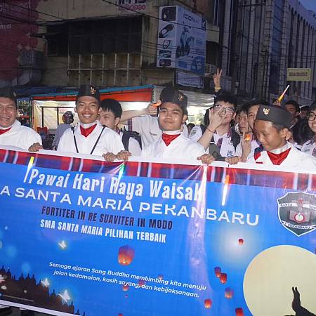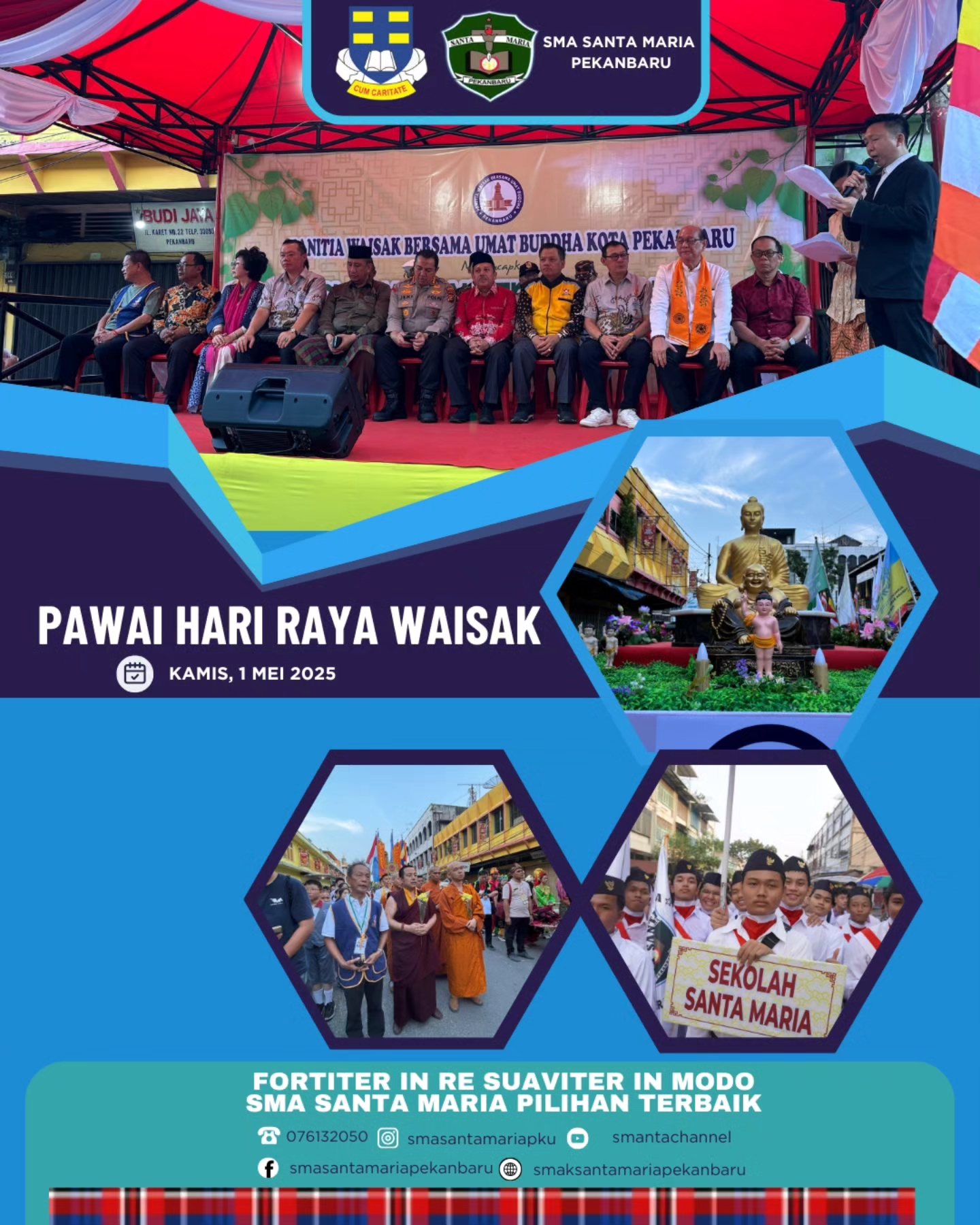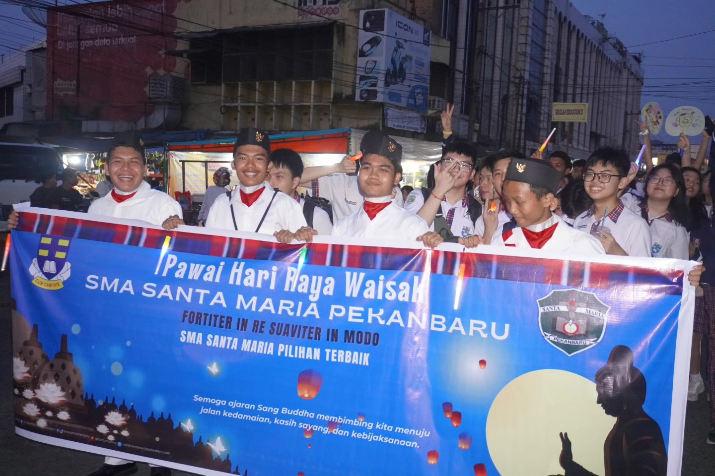 Pekanbaru, Kamis (1/5/2025) dilaksanakan pawai dalam rangka perayaan Waisak 2569 BE/2025 M, dengan tema "Tingkatkan pengendalian diri dan kebijaksanaan mewujudkan perdamaian dunia." SMA Santa Maria diundang untuk berpartisipasi dalam perayaan yang meriah ini. Perayaan ini dimulai dengan mengelilingi kawasan pusat kota Pekanbaru. Umat Buddha dari berbagai kelompok serta undangan berjalan bersama. SMA Santa Maria mengenakan pakaian sekolah dan lengkap dengan pasusnya. Sementara hadirin lainnya ada yang pakaian tradisional, membawa bendera, dan melantunkan mantra-mantra suci.