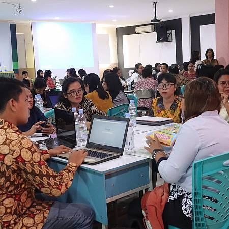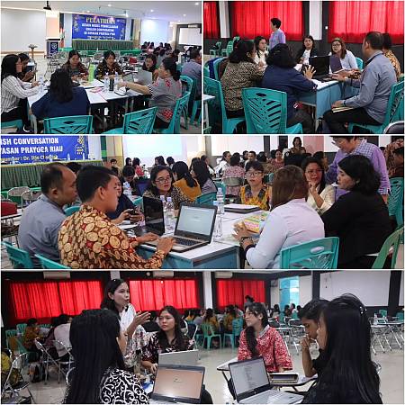 This training is organized in cooperation with PT Erlangga and the speaker mother Dr. Itje Chodijah. In this training, English teachers get material on English teaching techniques that focus on conversation. Then the training continued with a discussion of assembling English learning devices at all levels of each school.