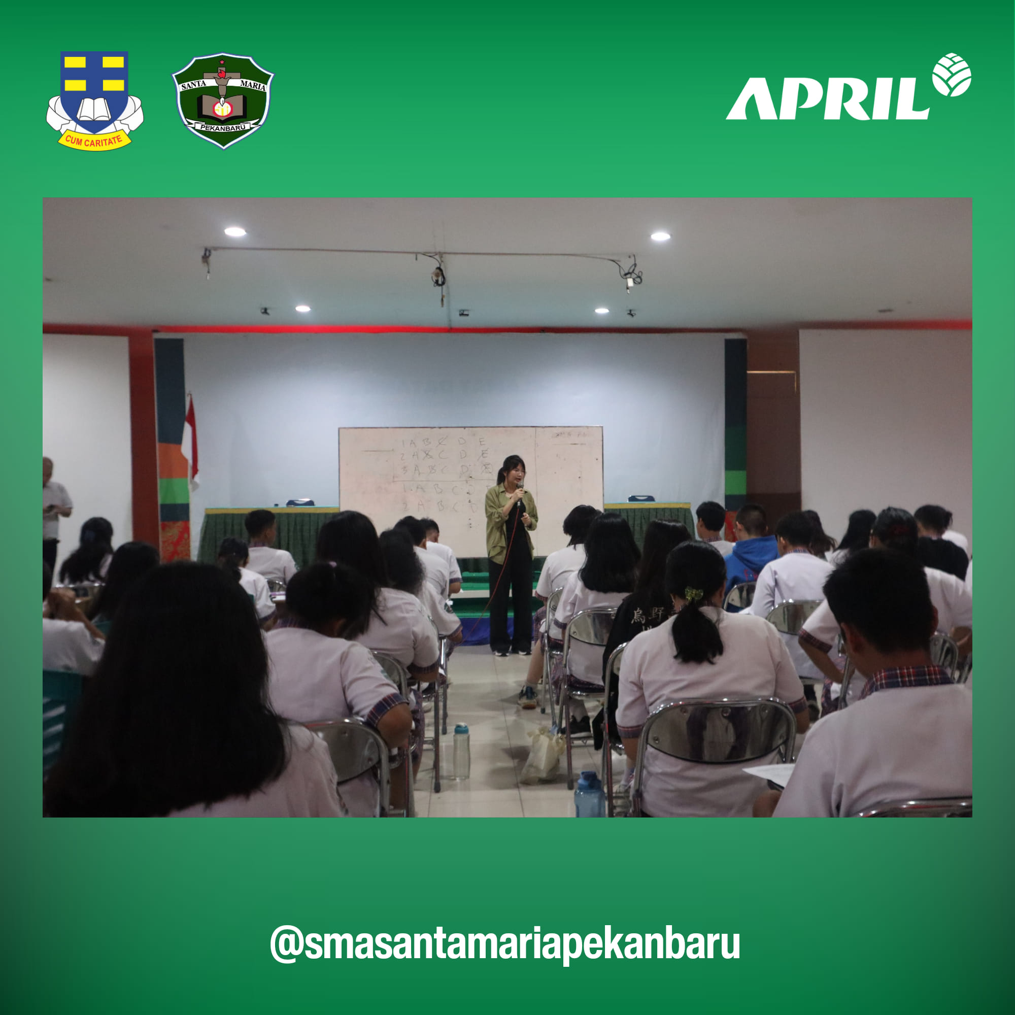 Kamis, 19 Oktober 2023, peserta didik SMA Santa Maria mendapatkan informasi tentang program beasiswa RAPP. Program Beasiswa RAPP bekerja sama antara SMA Santa Maria Pekanbaru dengan PT Riau Andalan Pulp & Paper, APRIL group sudah terjalin sejak lama. Dan prosesnya pun bertahap dari pagi sampai sore ini. Prosesnya cukup panjang untuk penyeleksian/pencarian bibit unggul, penerima beasiswa pendidikan, dan ikatan dinas bagi peserta didik SMA Santa Maria. Hari ini telah terselenggara dengan sukses.