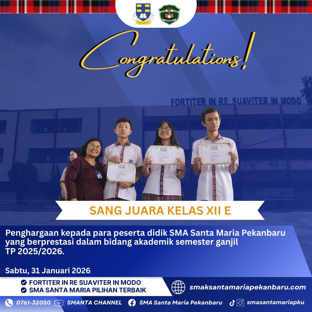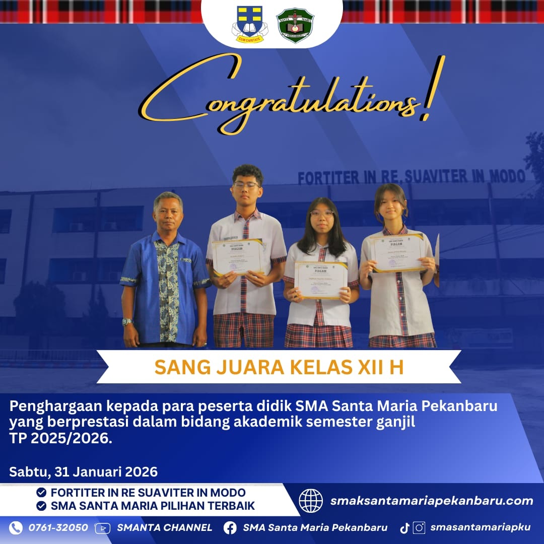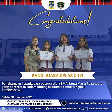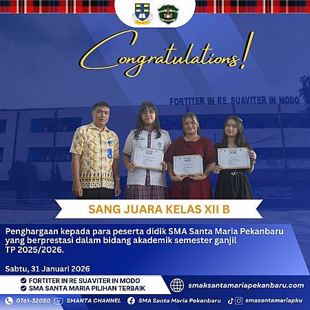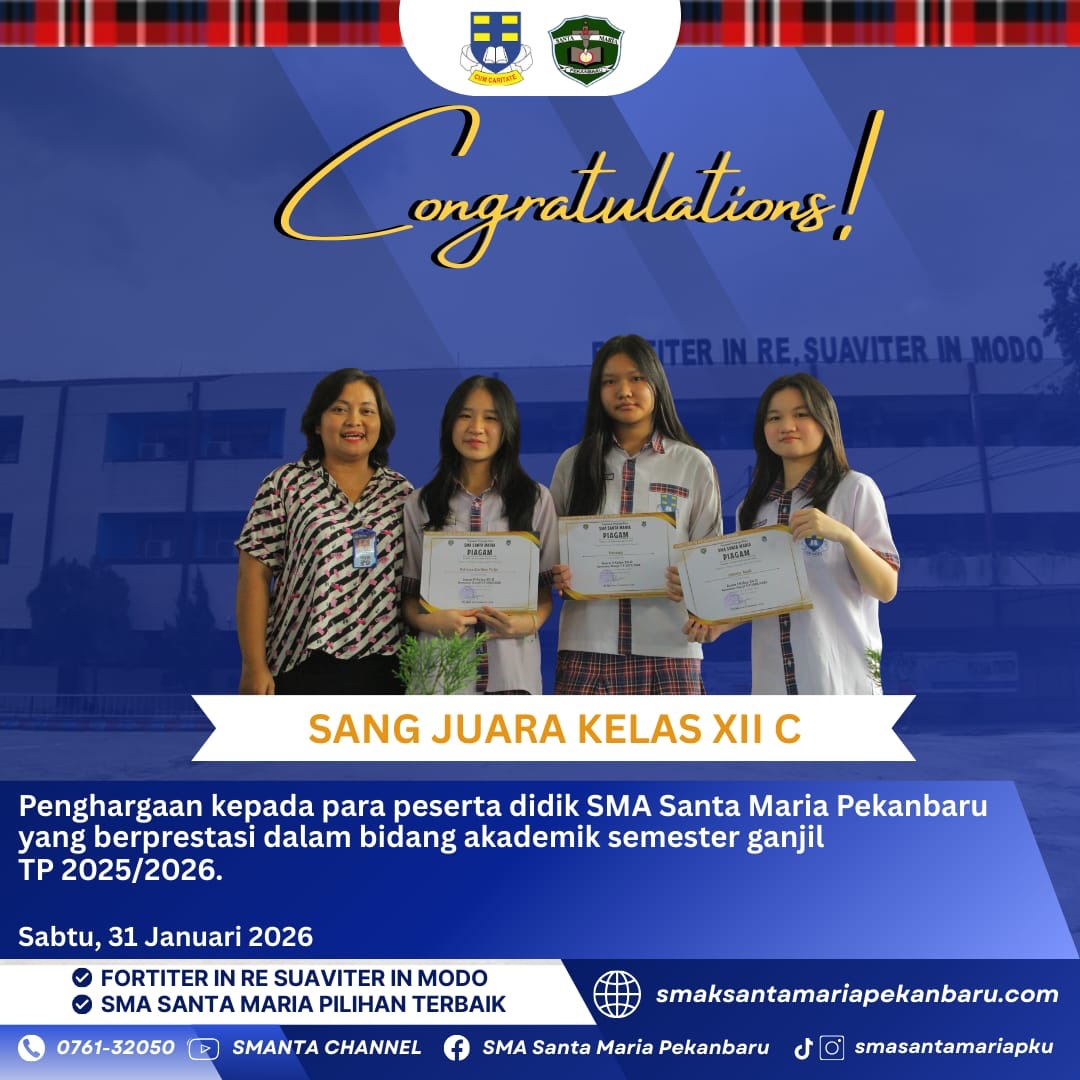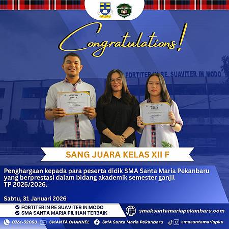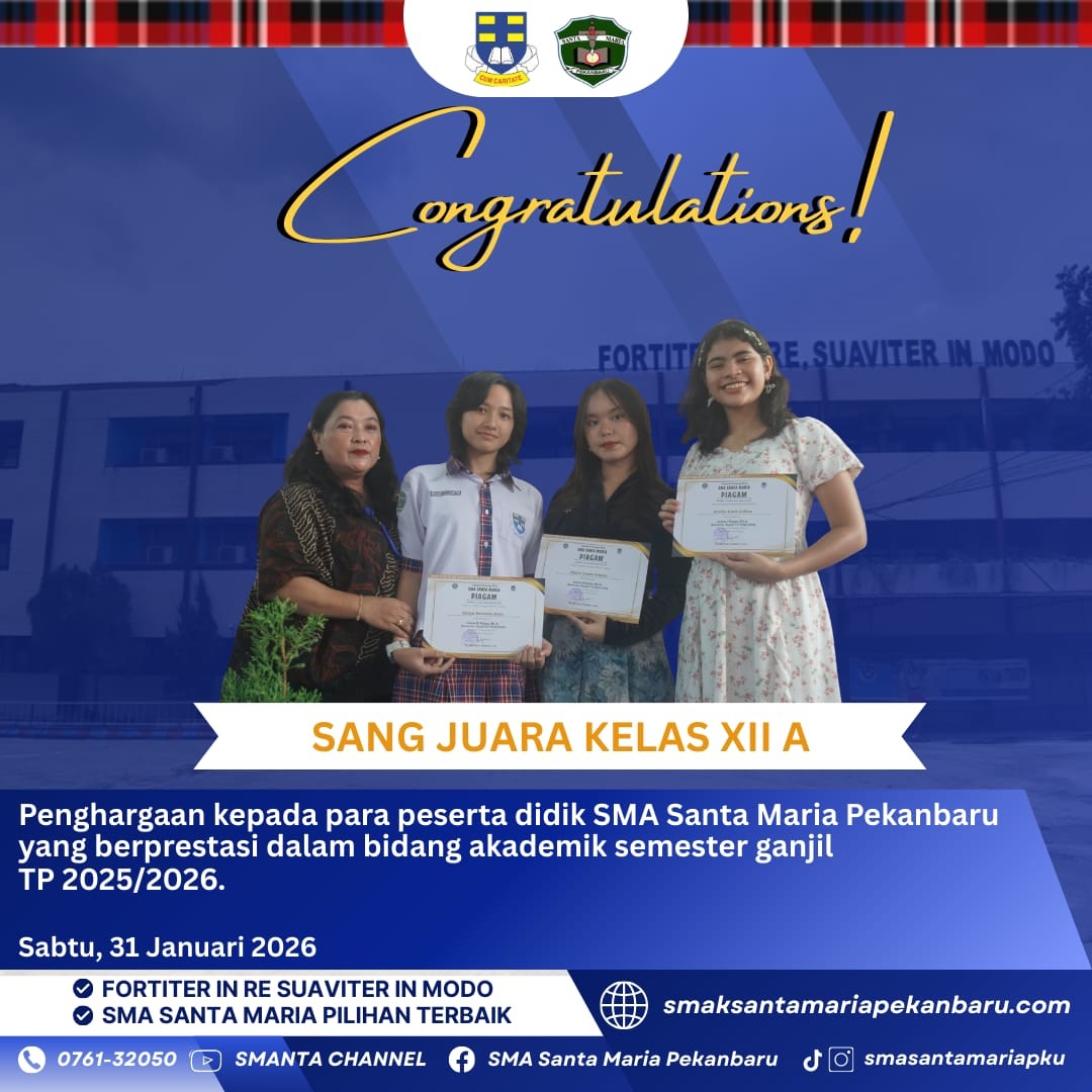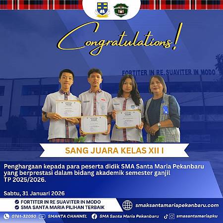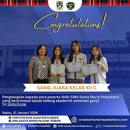 Panggung Sang Juara yang menjadi acara penghargaan kepada para peserta didik SMA Santa Maria Pekanbaru yang berprestasi dalam bidang akademik semester ganjil TP 2025/2026 kembali digelar pada hari Sabtu, 31 Januari 2026, pukul 7.30 hingga 10.30.