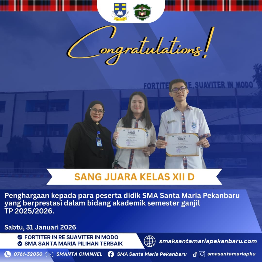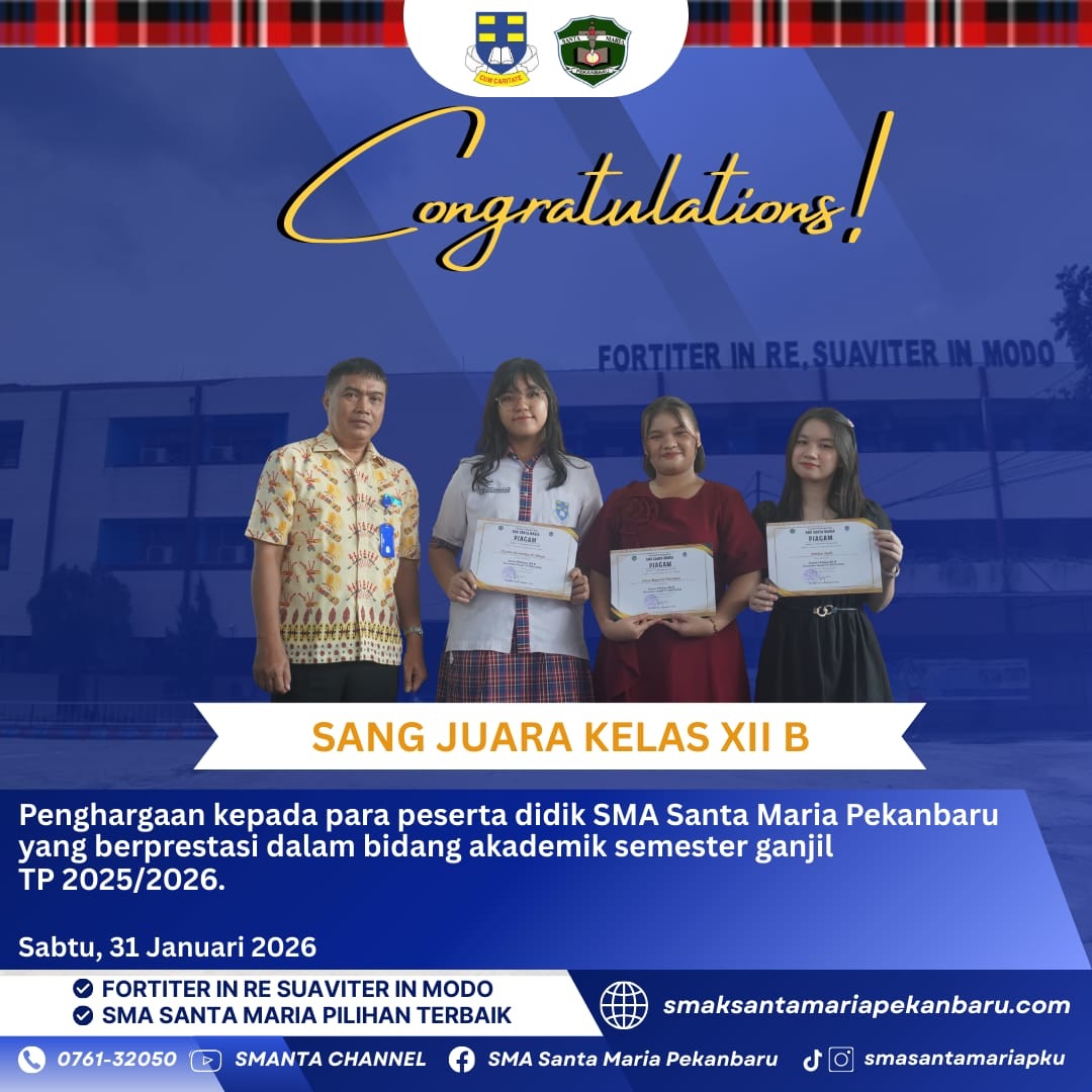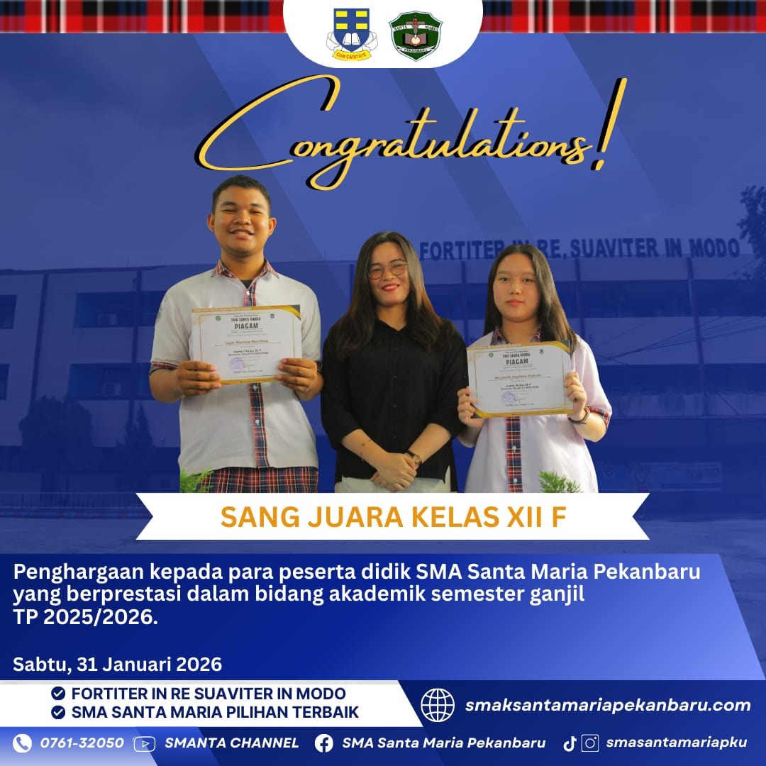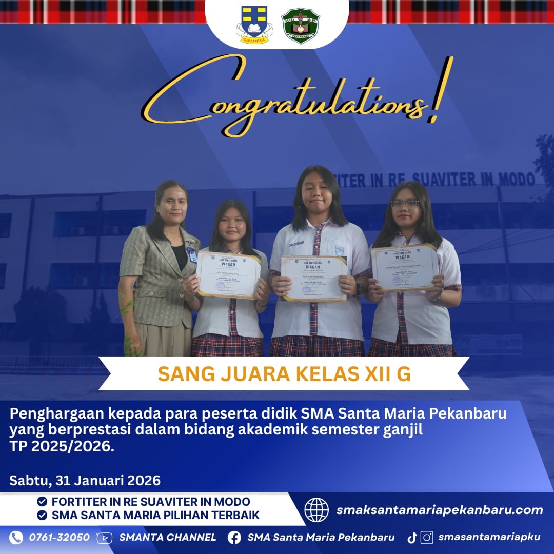 Panggung Sang Juara yang menjadi acara penghargaan kepada para peserta didik SMA Santa Maria Pekanbaru yang berprestasi dalam bidang akademik semester ganjil TP 2025/2026 kembali digelar pada hari Sabtu, 31 Januari 2026, pukul 7.30 hingga 10.30.
