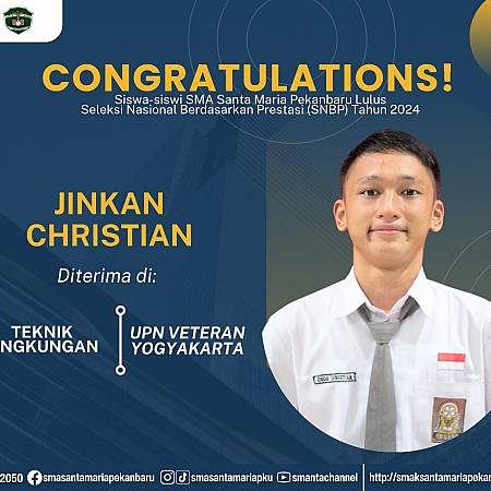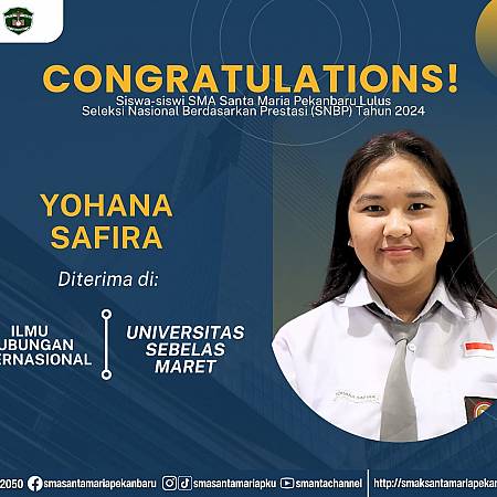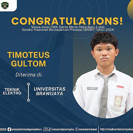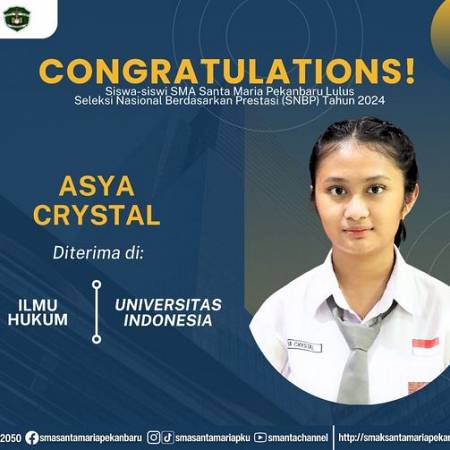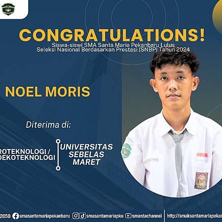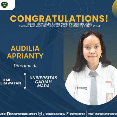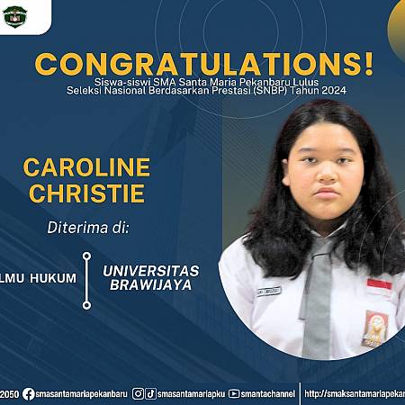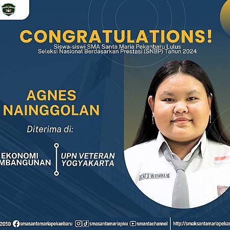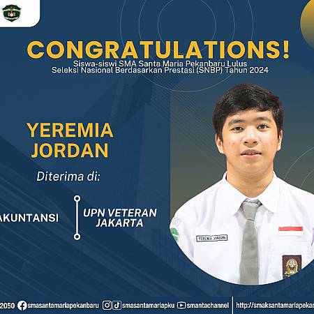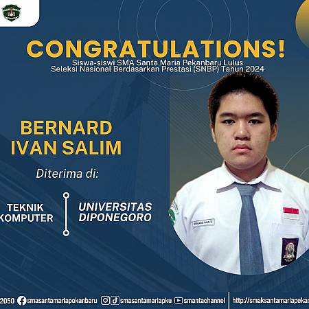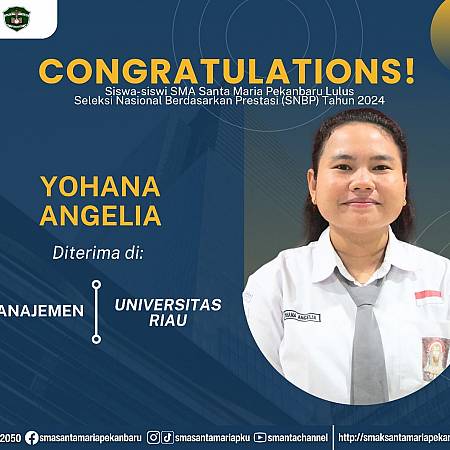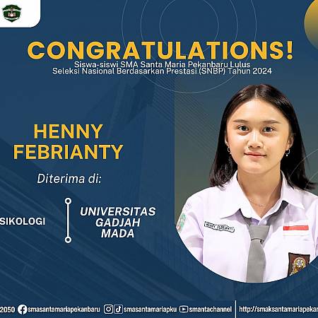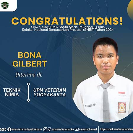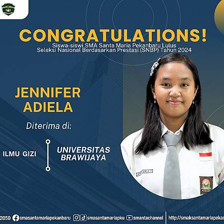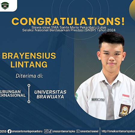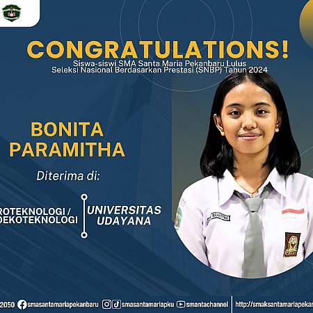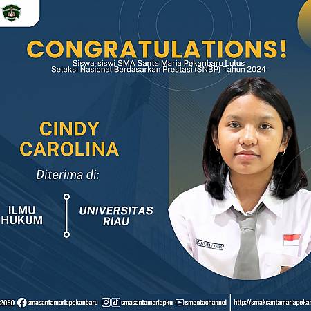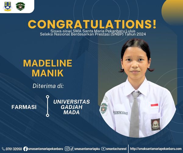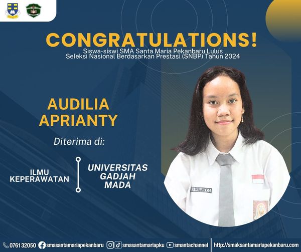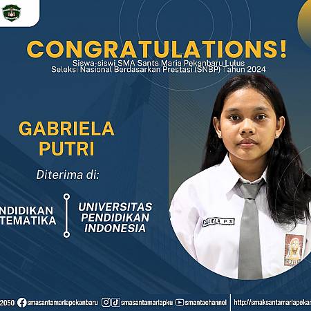 Selamat dan sukses untuk Peserta Didik SMA Santa Maria Pekanbaru yang LULUS DITERIMA di Perguruan Tinggi Negeri lewat jalur Seleksi Nasional Berdasarkan Prestasi (SNBP).