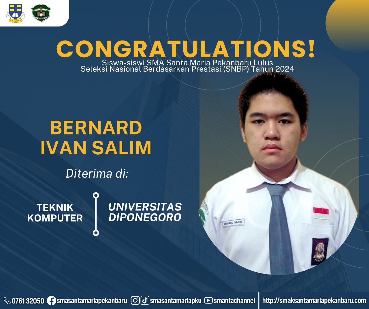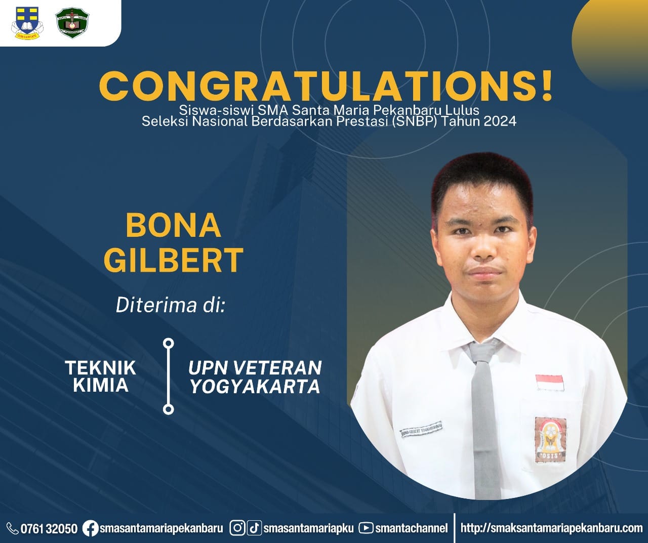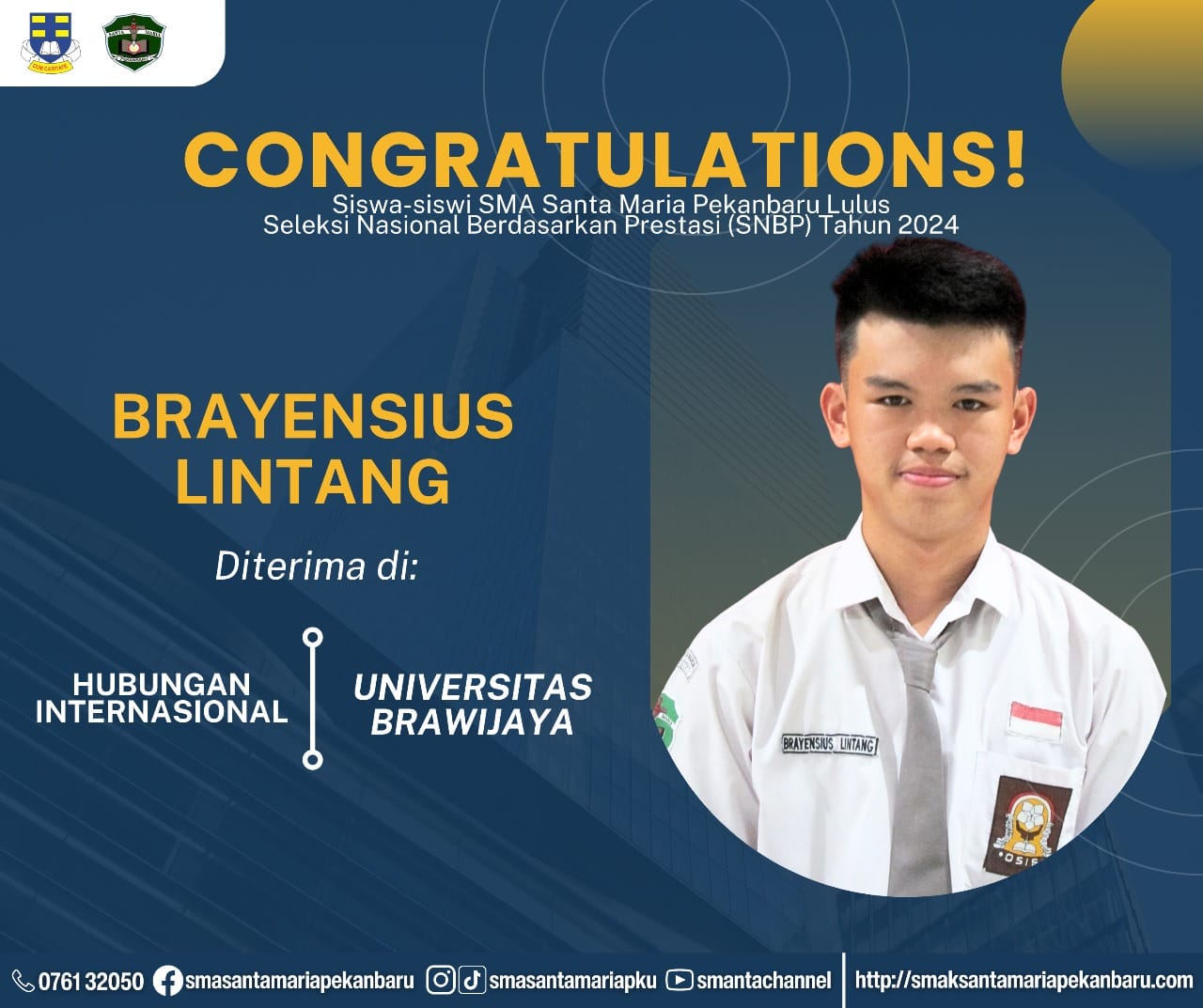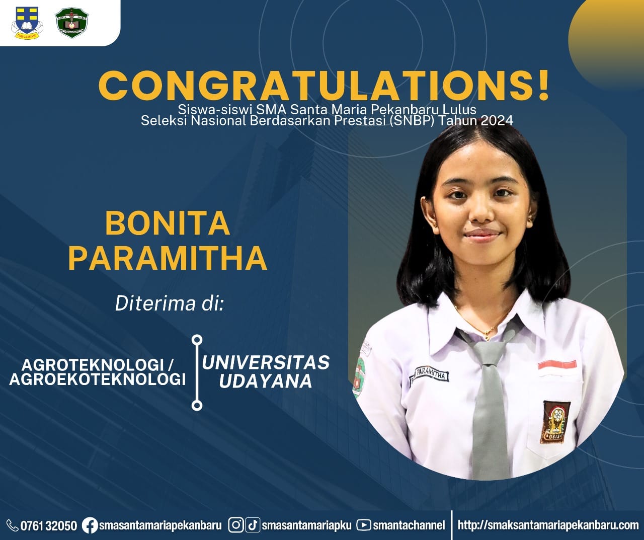 Selamat dan sukses untuk Peserta Didik SMA Santa Maria Pekanbaru yang LULUS DITERIMA di Perguruan Tinggi Negeri lewat jalur Seleksi Nasional Berdasarkan Prestasi (SNBP).