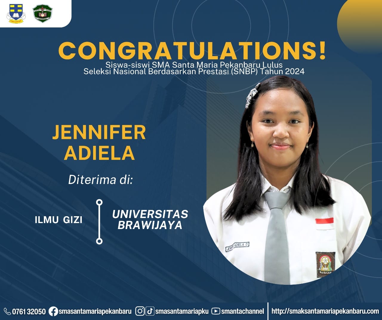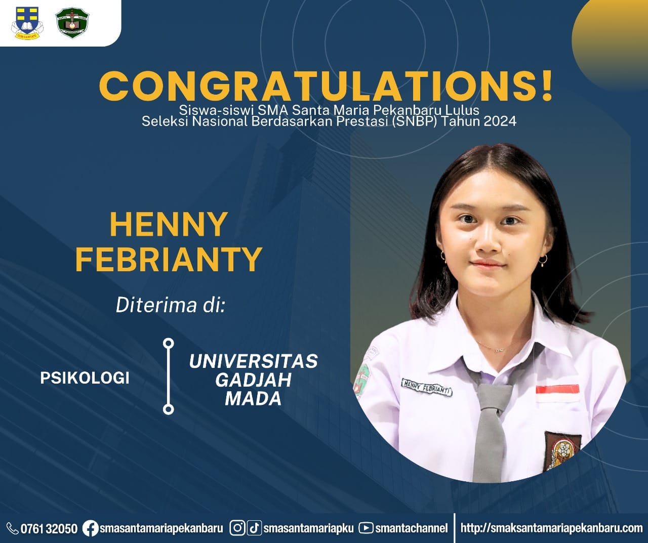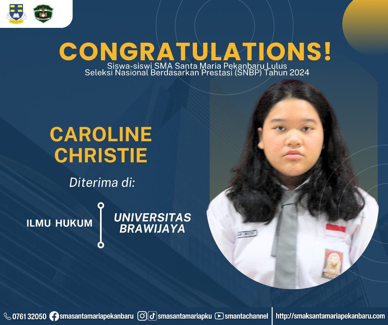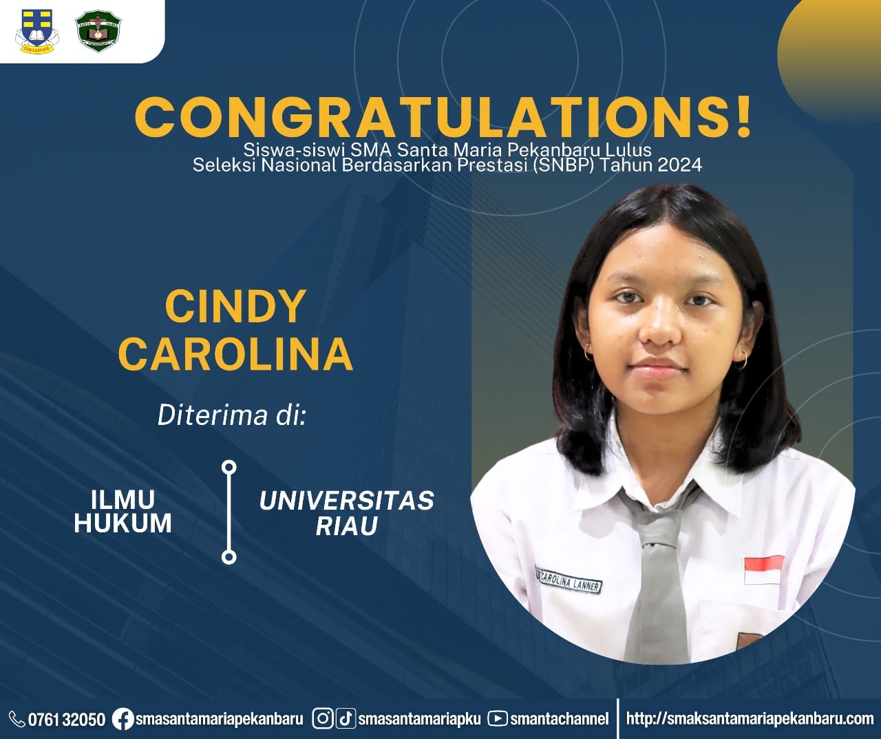 Selamat dan sukses untuk Peserta Didik SMA Santa Maria Pekanbaru yang LULUS DITERIMA di Perguruan Tinggi Negeri