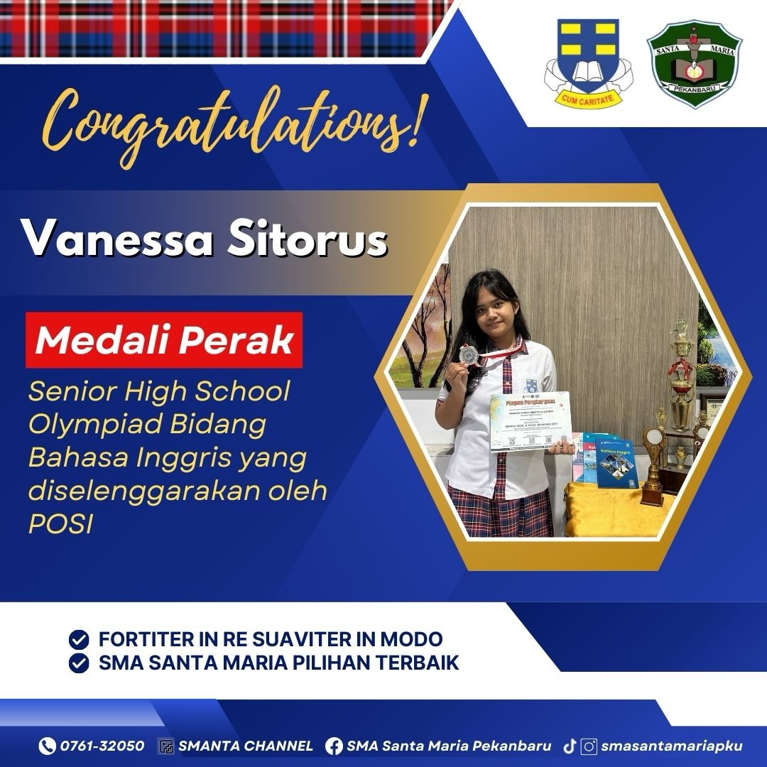 Selamat kepada Vanessa Sitorus, siswi kelas XI H, yang berhasil meraih Medali Perak pada Senior High School Olympiad bidang Bahasa Inggris yang diselenggarakan oleh POSI.