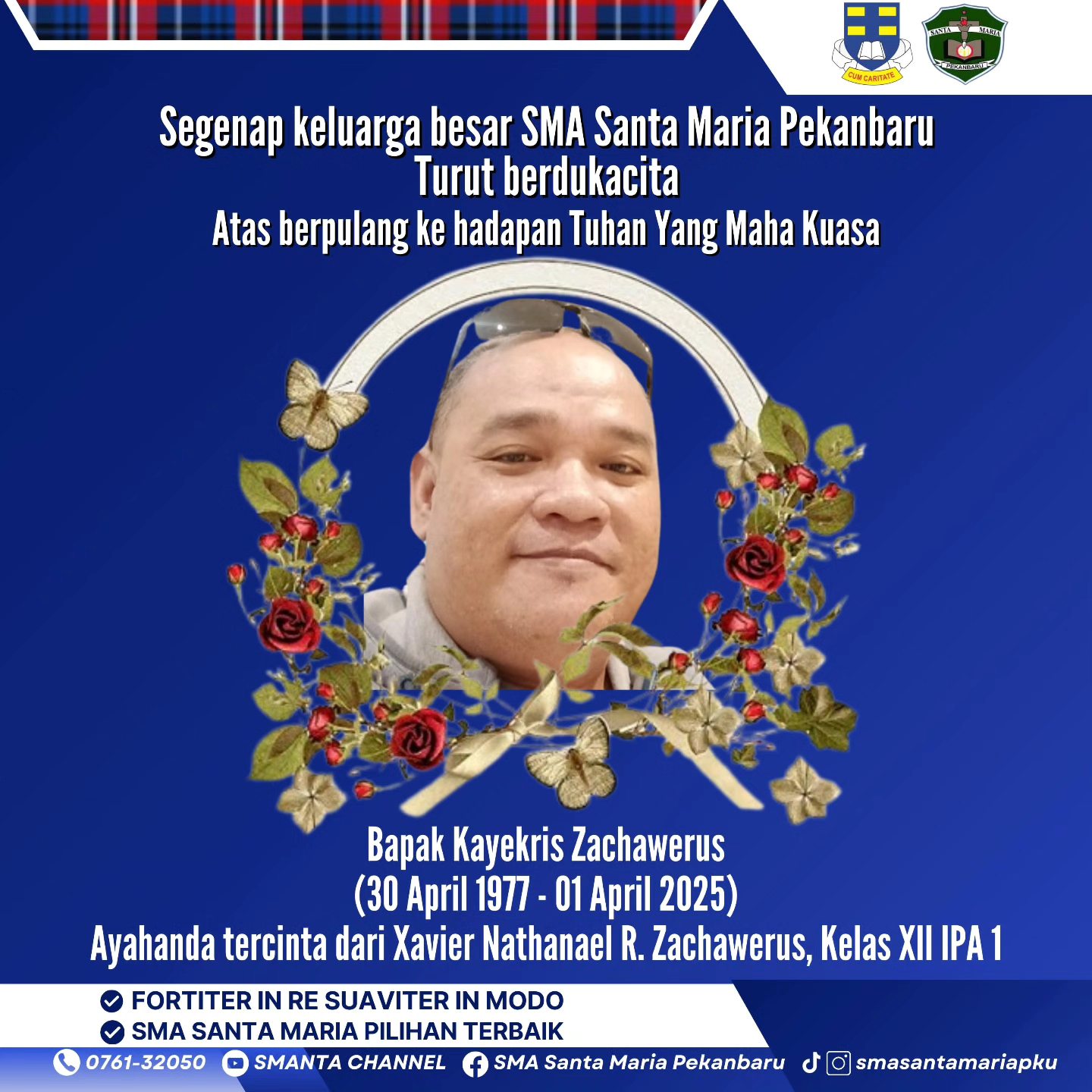 Seluruh keluarga besar SMA Santa Maria Pekanbaru turut berdukacita atas berpulangnya ke hadapan Tuhan Yang Maha Kuasa, Bapak Kayekris Zachawerus (30 April 1977 - 1 April 2025), Ayahanda tercinta dari ananda Xavier Nathanael R. Zachawerus, Kelas XII IPA 1 SMA Santa Maria Pekanbaru.