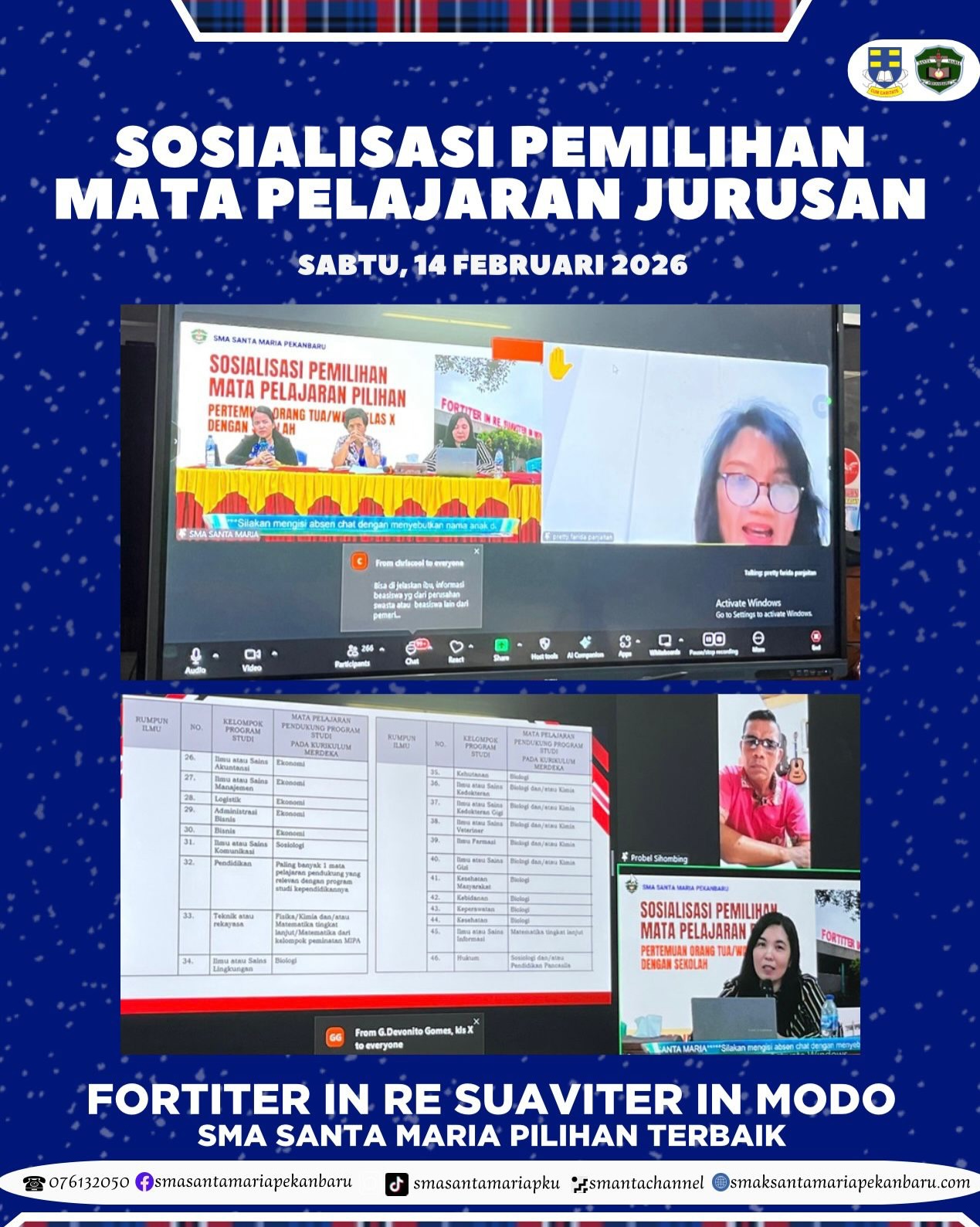Sabtu, 14 Febuari 2026 SMA Santa Maria mengadakan Sosialisasi Pemilihan Mata Pelajaran Jurusan Kelas X secara virtual melalui Zoom Meeting.Bersama orang ...
