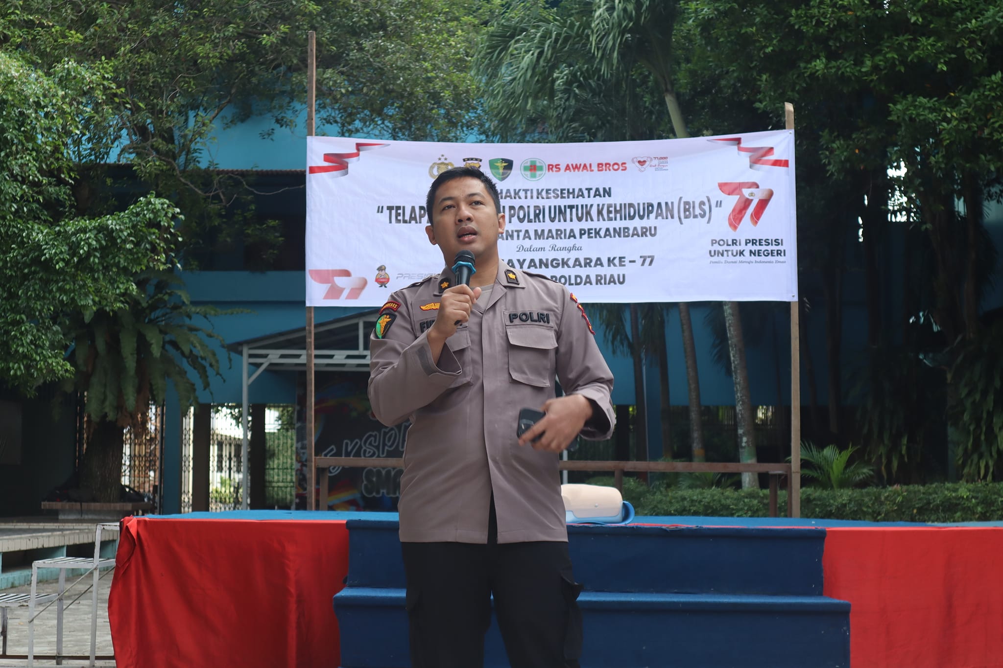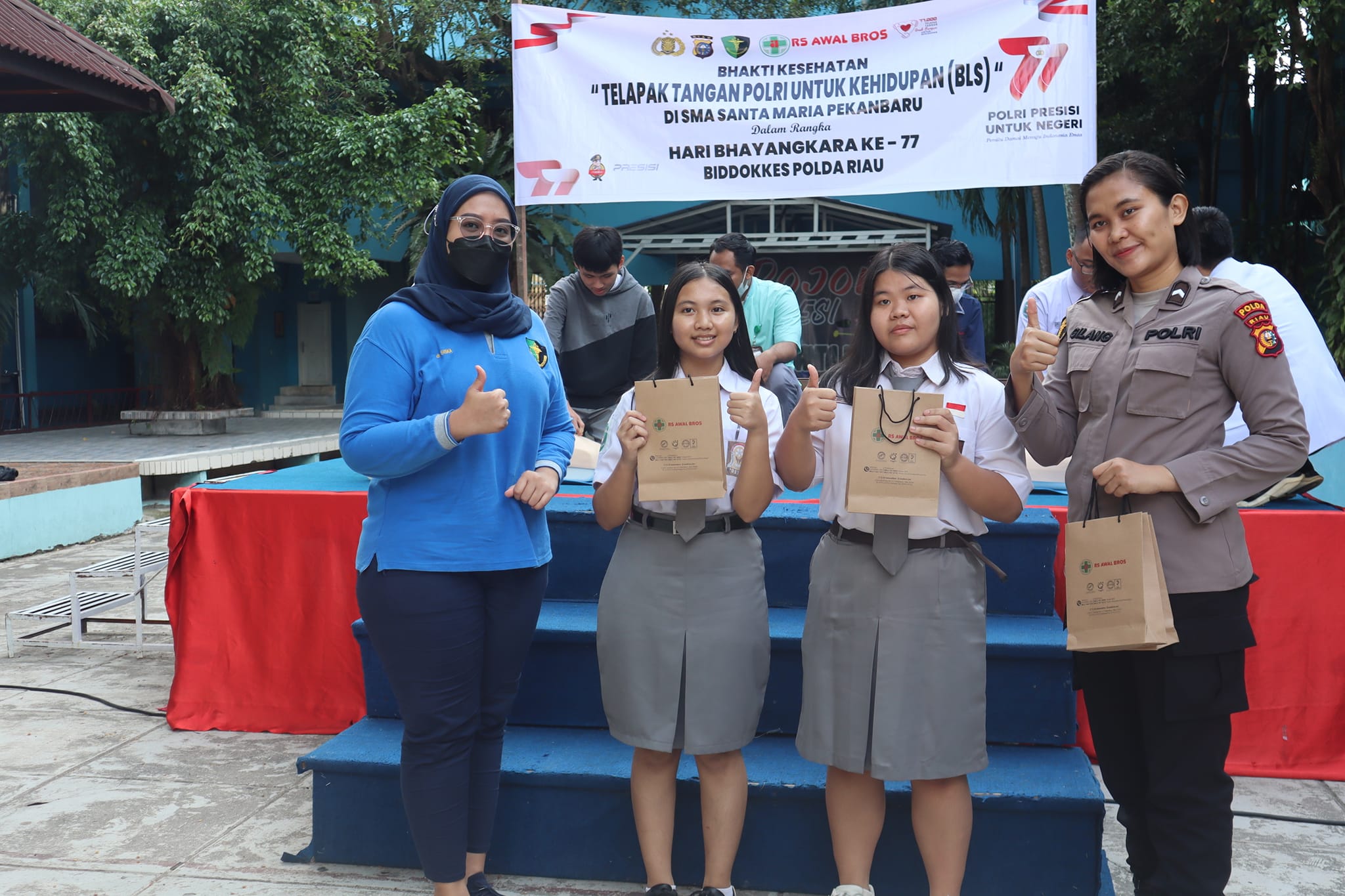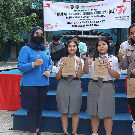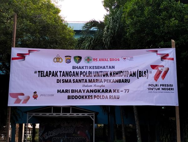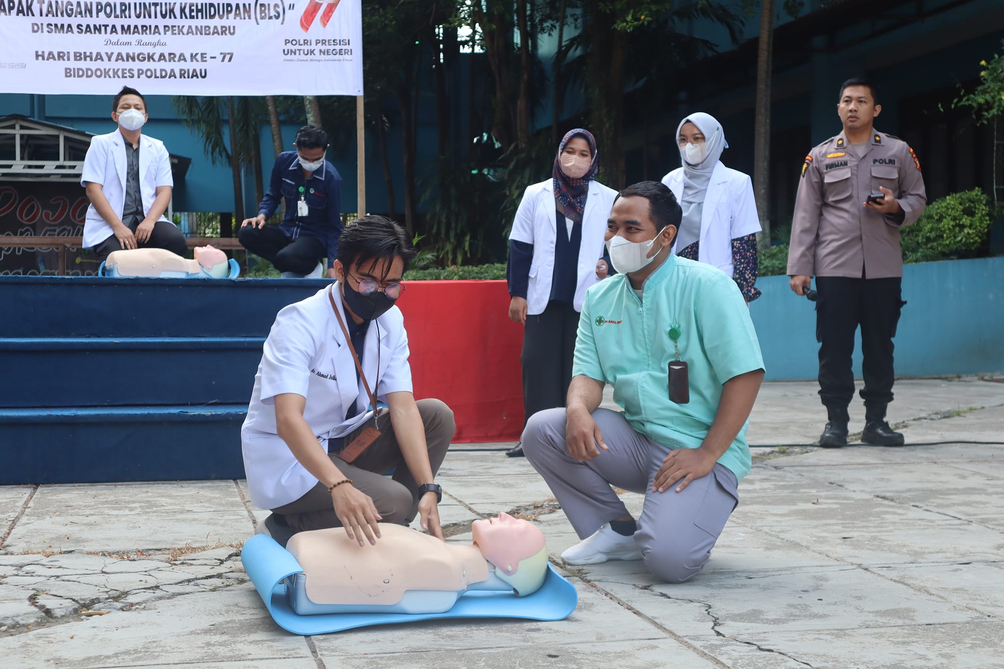 BIDOKKES POLDA RIAU dan RS Awal Bros memberi pelayanannya kepada SMA Santa Maria Pekanbaru pada Senin (12/6/23) dalam rangka memperingati Hari Bhayangkara Ke-77 maka dilaksanakan kegiatan sosialisasi dan pelatihan Bantuan Hidup Dasar (BHD).