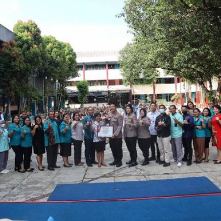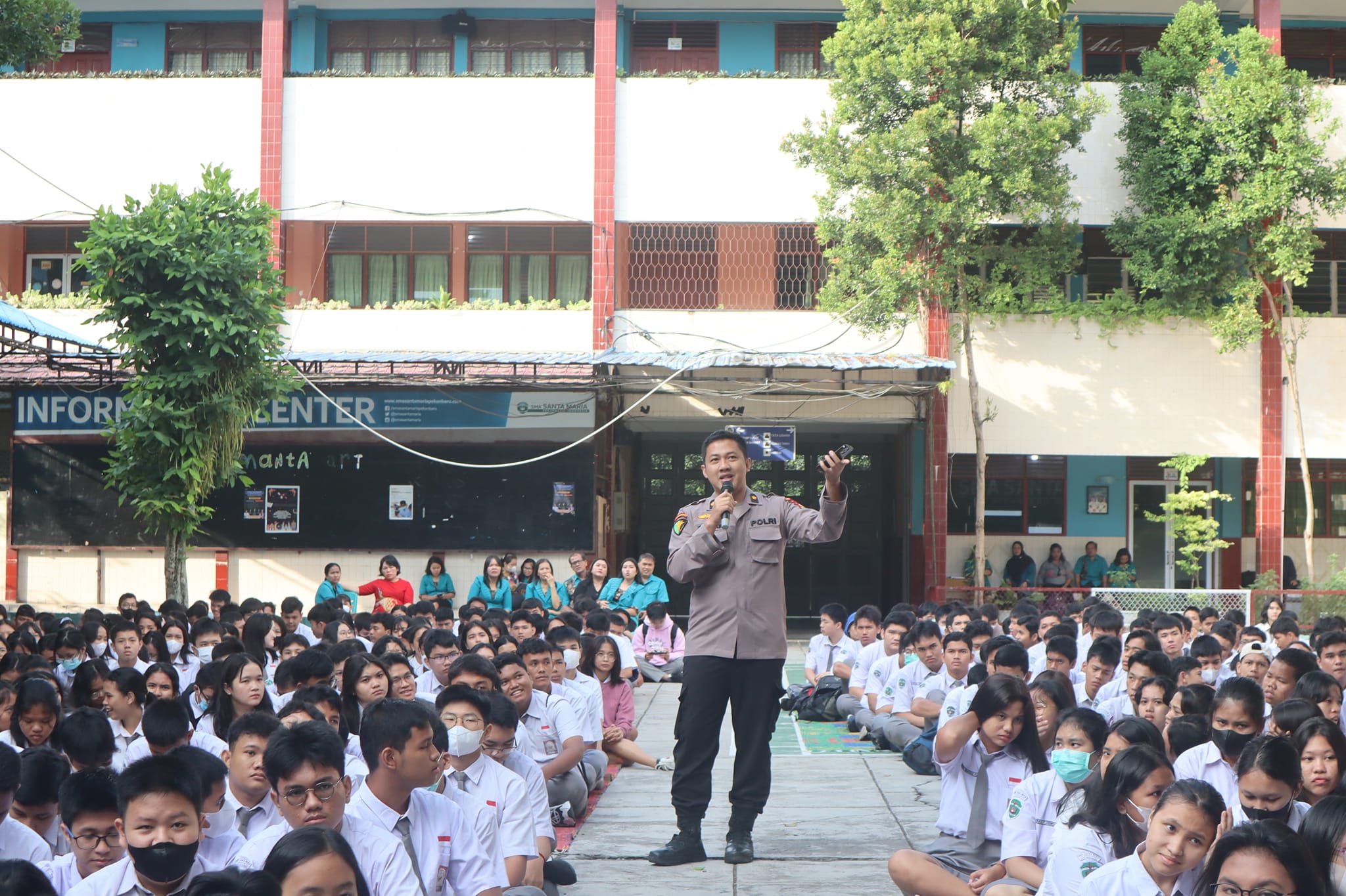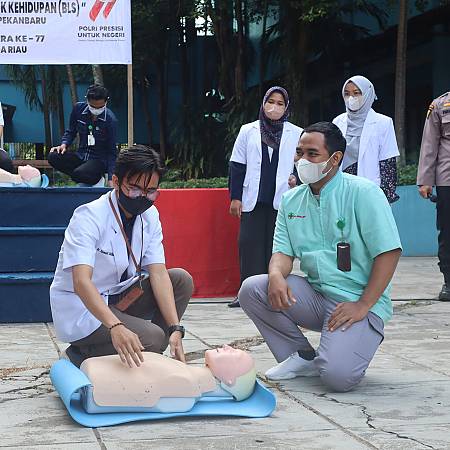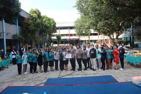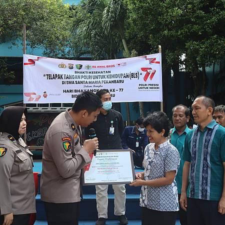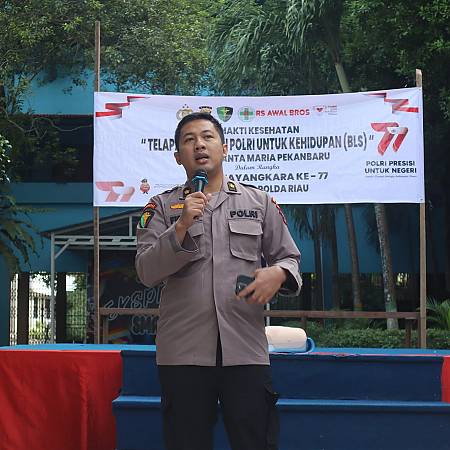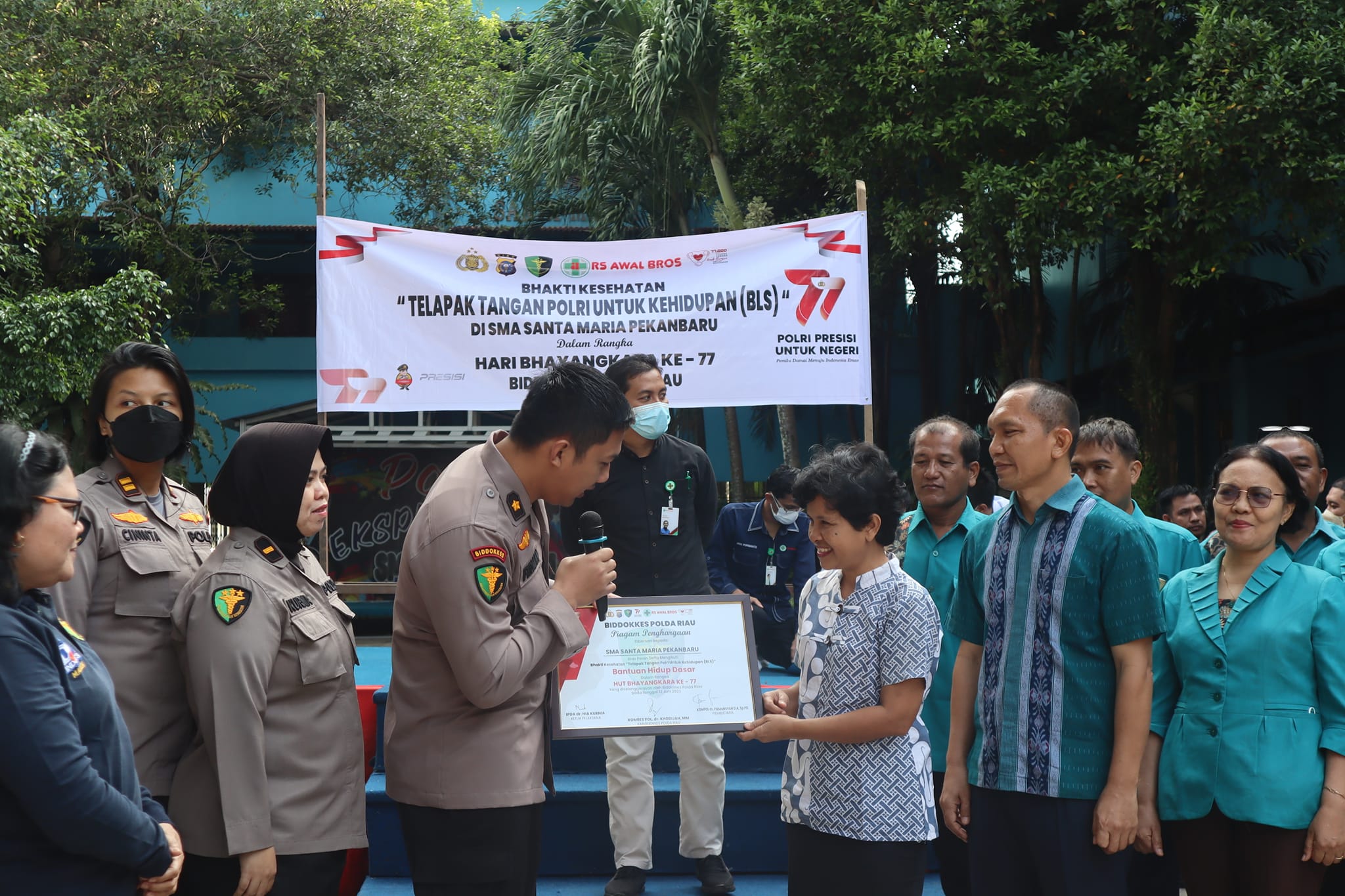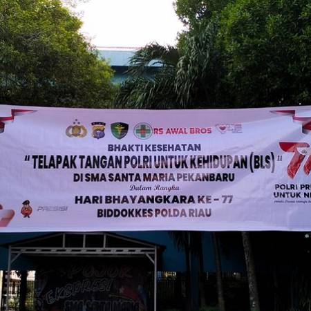 BIDOKKES POLDA RIAU dan RS Awal Bros memberi pelayanannya kepada SMA Santa Maria Pekanbaru pada Senin (12/6/23) dalam rangka memperingati Hari Bhayangkara Ke-77 maka dilaksanakan kegiatan sosialisasi dan pelatihan Bantuan Hidup Dasar (BHD).